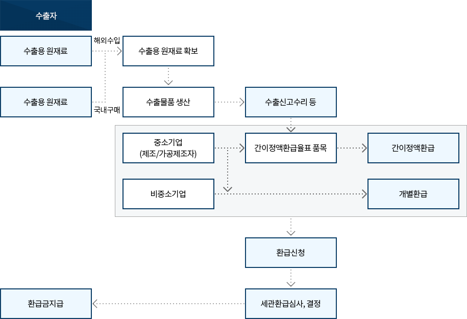 관세환급은 환급특례법에 규정된 요건을 충족하면 수입 시 납부한 관세 등을 되돌려주는 것입니다. 수입 원재료를 수출 또는 외화획득용 원재료로 사용한 경우에는 신청에 의해 수입하는 때 납부한 관세를 수출자 또는 생산자에게 되돌려 줍니다.